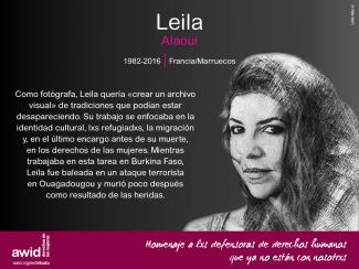 En nuestro Tributo Virtual 2015 honramos a cinco defensoras de derechos humanos asesinadas en la región de Medio Oriente y África del Norte. Estas defensoras trabajaron por los derechos de las mujeres y los derechos civiles, en su rol de abogadas y activistas. Sus muertes ponen en evidencia las condiciones de trabajo peligrosas y difíciles que, a menudo, imperan en sus países. Únete a AWID para honrar a estas mujeres, su activismo y su legado, compartiendo los memes aquí incluidos con tus colegas, amistades y redes; y tuiteando las etiquetas #WHRDTribute y #16Días.