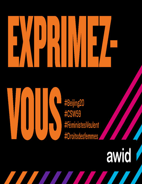 A l'occasion de la 59ème Commission de la condition de la femme (CSW 59), et en réponse à l'invitation adressée à notre Directrice exécutive pour s'exprimer à l'ouverture de la 59ème session de la Commission, l'AWID a appelé les féministes et les défenseuses des droits des femmes à travers le monde à partager trois messages clés sur les droits des femmes auprès des dirigeant-e-s de l'ONU et de gouvernement.