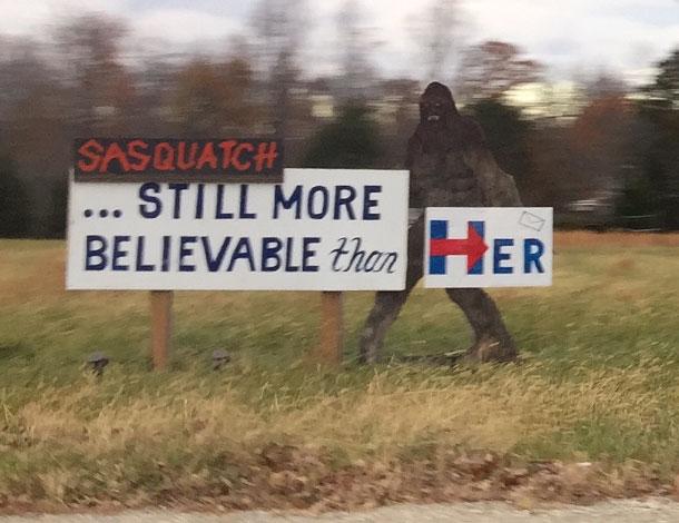 Pre election, there were few campaign signs in my neighbors’ yards; I saw two for Cruz and one each for Trump and Sanders. Then one appeared, not far from my polling place, the week before the election: a giant cut-out of Sasquatch with the words “still more believable than her” (with the H resembling the logo of Hillary Clinton’s campaign). Even as the polls were closing on election night, I still didn’t believe Trump could be elected to the highest office in the country. Until he was.